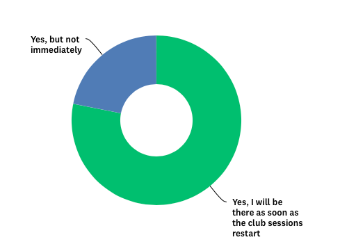 The majority (78%) of you are planning to return to training as soon as you can, or will wait until the social distancing rules are relaxed a little further.