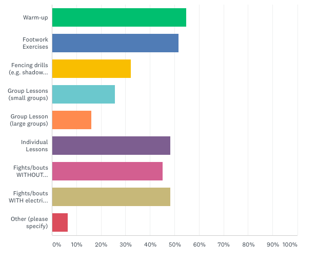 There are many aspects to a regular club session, and unsurprisingly, there was a lot of variation in what you’d all like to see. From the responses, we will aim to provide warm-up and footwork exercises, fighting/sparring on the electric equipment, and lessons in some form. These may all need to be modified to take account of the new rules, and we will be able to tell you more about this soon.